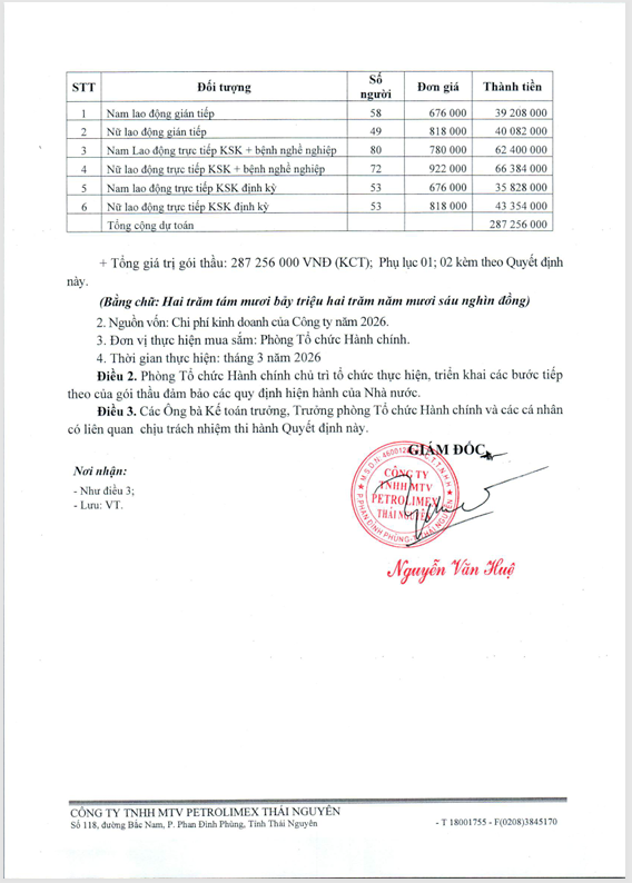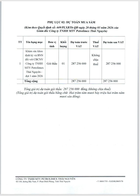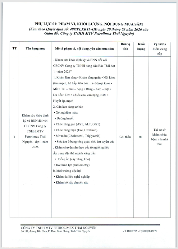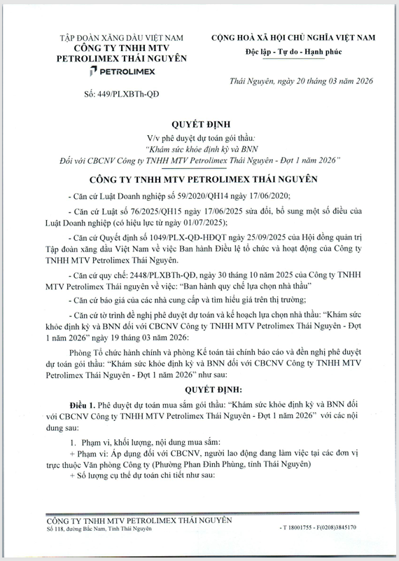 - Căn cứ tờ trình đề nghị phê duyệt dự toán và kế hoạch lựa chọn nhà thầu: “Khám sức khỏe định kỳ và BNN đối với CBCNV Công ty TNHH MTV Petrolimex Thái Nguyên - Đợt 1 năm 2026” ngày 19 tháng 03 năm 2026: