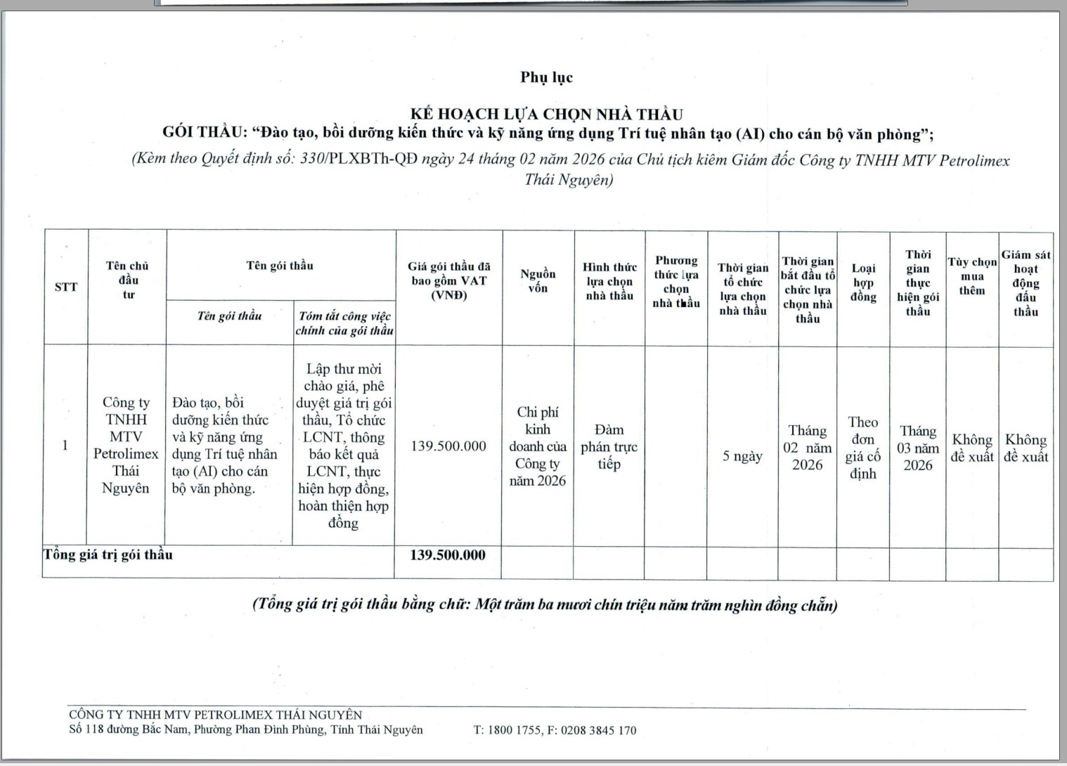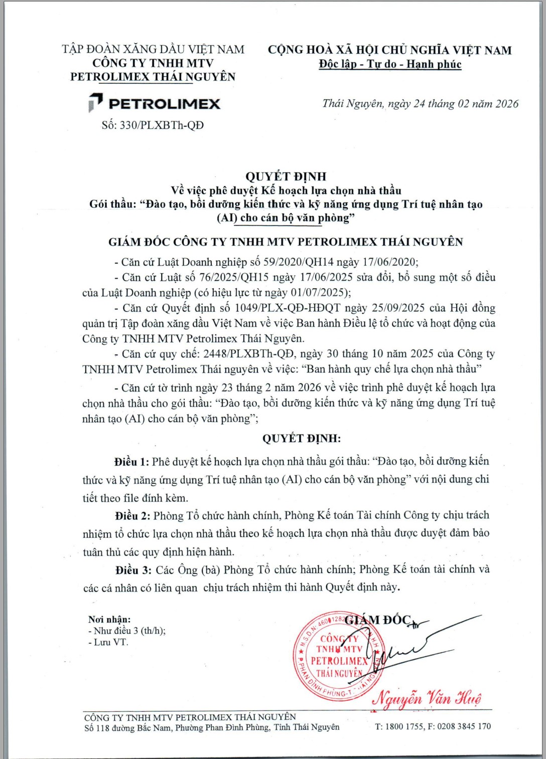 - Căn cứ quy chế: 2448/PLXBTh-QĐ, ngày 30 tháng 10 năm 2025 của Công ty TNHH MTV Petrolimex Thái nguyên về việc: “Ban hành quy chế lựa chọn nhà thầu”