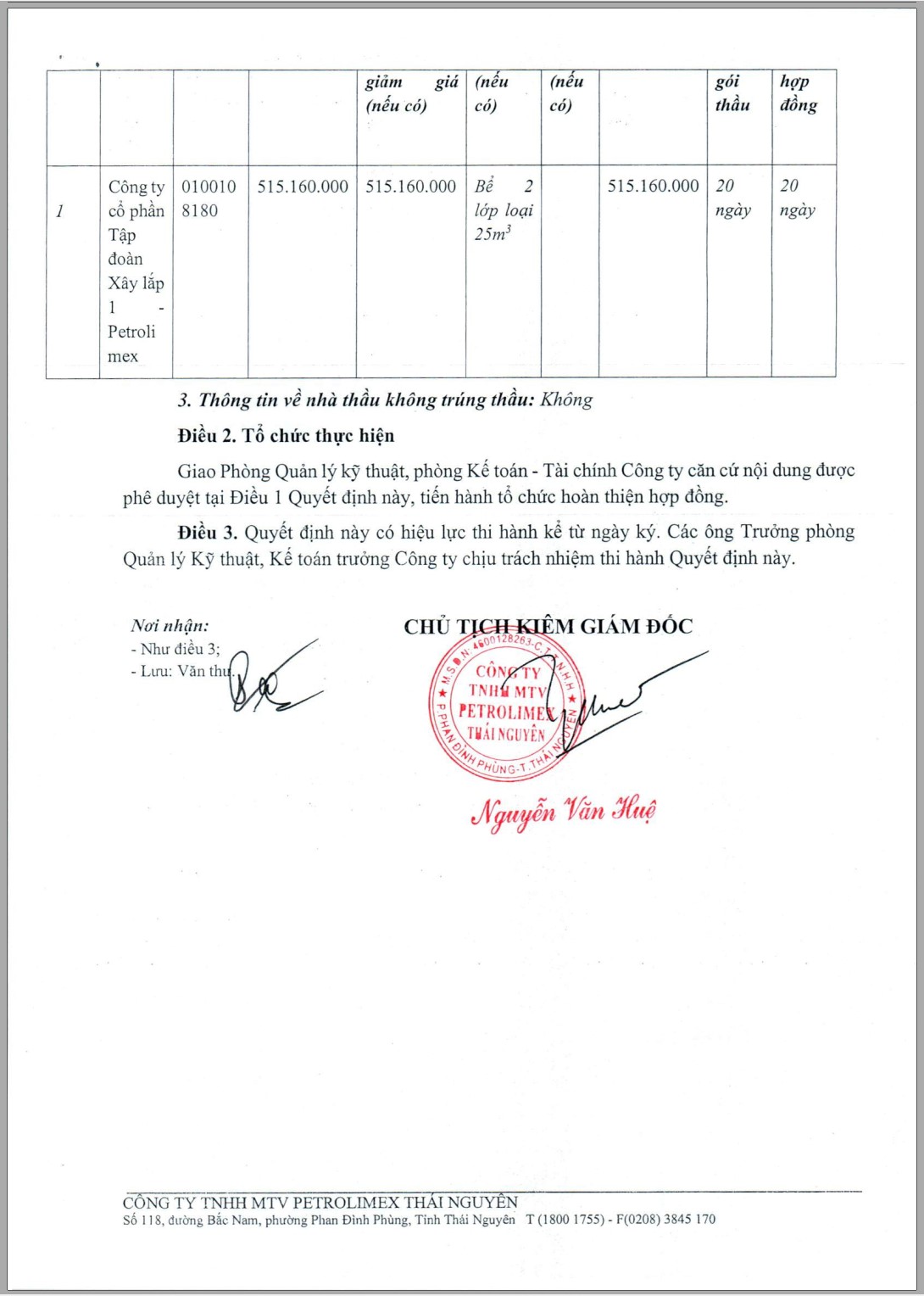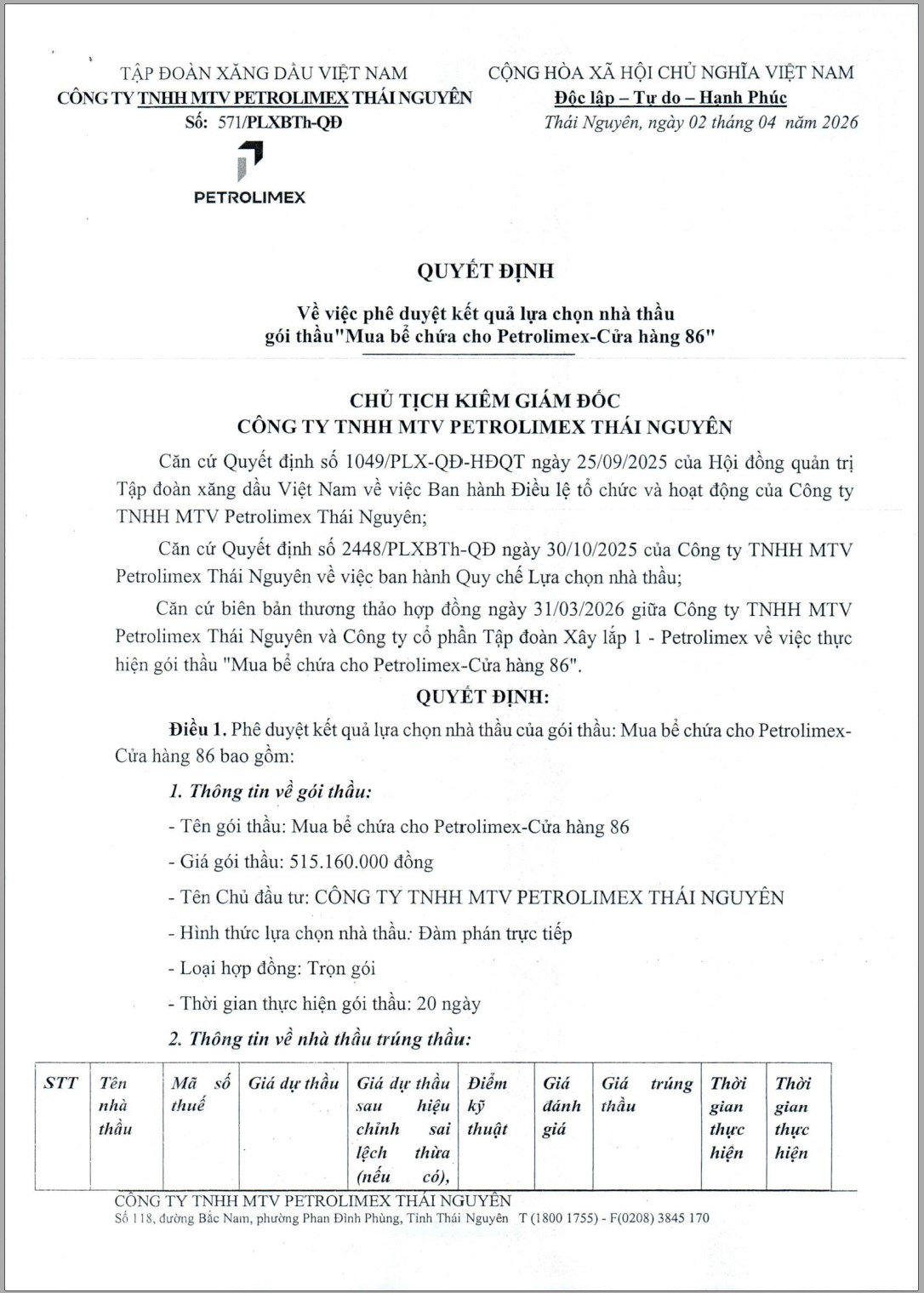 Căn cứ biên bản thương thảo hợp đồng ngày 31/03/2026 giữa Công ty TNHH MTV Petrolimex Thái Nguyên và Công ty cổ phần Tập đoàn Xây lắp 1 - Petrolimex về việc thực hiện gói thầu "Mua bể chứa cho Petrolimex-Cửa hàng 86";