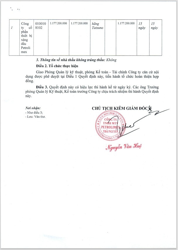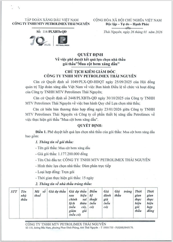 Căn cứ Quyết định số 1049/PLX-QĐ-HĐQT ngày 25/09/2025 của Hội đồng quản trị Tập đoàn xăng dầu Việt Nam về việc Ban hành Điều lệ tổ chức và hoạt động của Công ty TNHH MTV Petrolimex Thái Nguyên; Căn cứ Quyết định số 2448/PLXBTh-QĐ ngày 30/10/2025 của Công ty TNHH MTV Petrolimex Thái Nguyên về việc ban hành Quy chế Lựa chọn nhà thầu; Căn cứ biên bản thương thảo hợp đồng ngày 23/01/2026 giữa Công ty TNHH MTV Petrolimex Thái Nguyên và Công ty cổ phần thiết bị xăng dầu Petrolimex về việc thực hiện gói thầu "Mua cột bơm xăng dầu".