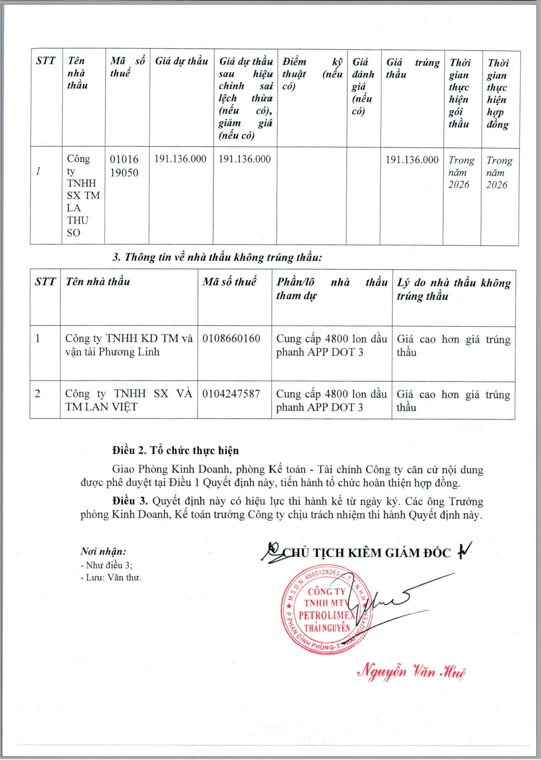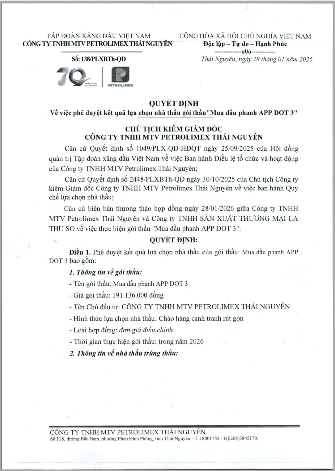 Căn cứ Quyết định số 1049/PLX-QĐ-HĐQT ngày 25/09/2025 của Hội đồng quản trị Tập đoàn xăng dầu Việt Nam về việc Ban hành Điều lệ tổ chức và hoạt động của Công ty TNHH MTV Petrolimex Thái Nguyên; Căn cứ Quyết định số 2448/PLXBTh-QĐ ngày 30/10/2025 của Chủ tịch Công ty kiêm Giám đốc Công ty TNHH MTV Petrolimex Thái Nguyên về việc ban hành Quy chế lựa chọn nhà thầu; Căn cứ biên bản thương thảo hợp đồng ngày 28/01/2026 giữa Công ty TNHH MTV Petrolimex Thái Nguyên và Công ty TNHH SẢN XUẤT THƯƠNG MẠI LA THU SO về việc thực hiện gói thầu "Mua dầu phanh APP DOT 3".