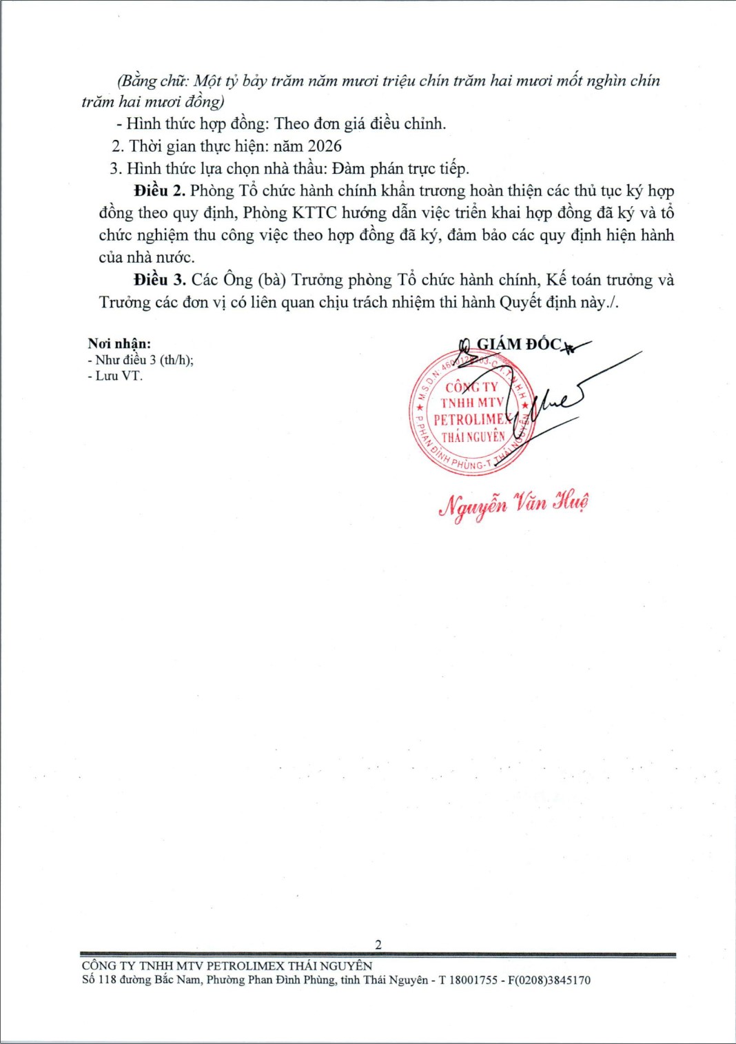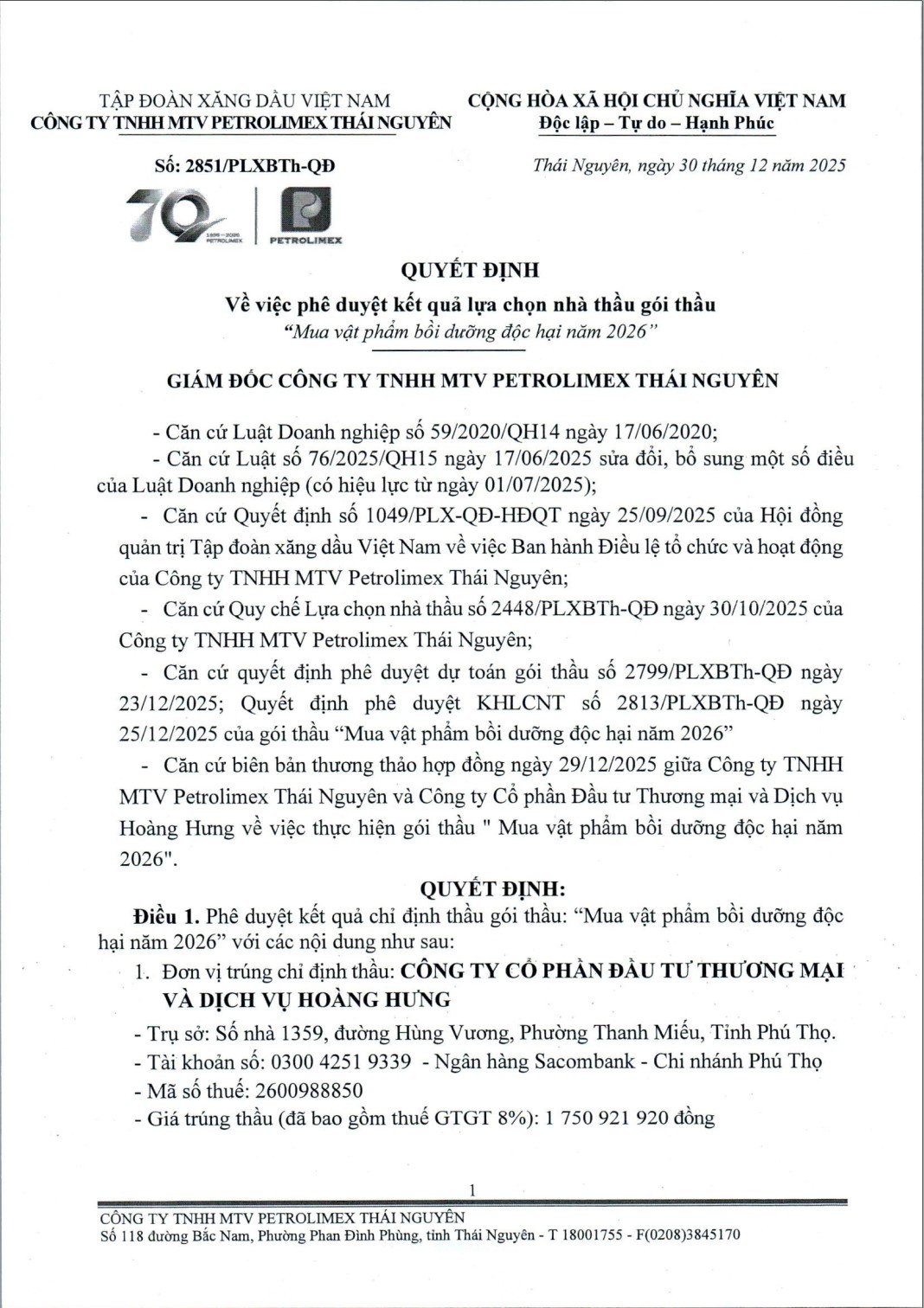 Căn cứ biên bản thương thảo hợp đồng ngày 29/12/2025 giữa Công ty TNHH MTV Petrolimex Thái Nguyên và Công ty Cổ phần Đầu tư Thương mại và Dịch vụ Hoàng Hưng về việc thực hiện gói thầu " Mua vật phẩm bồi dưỡng độc hại năm 2026".