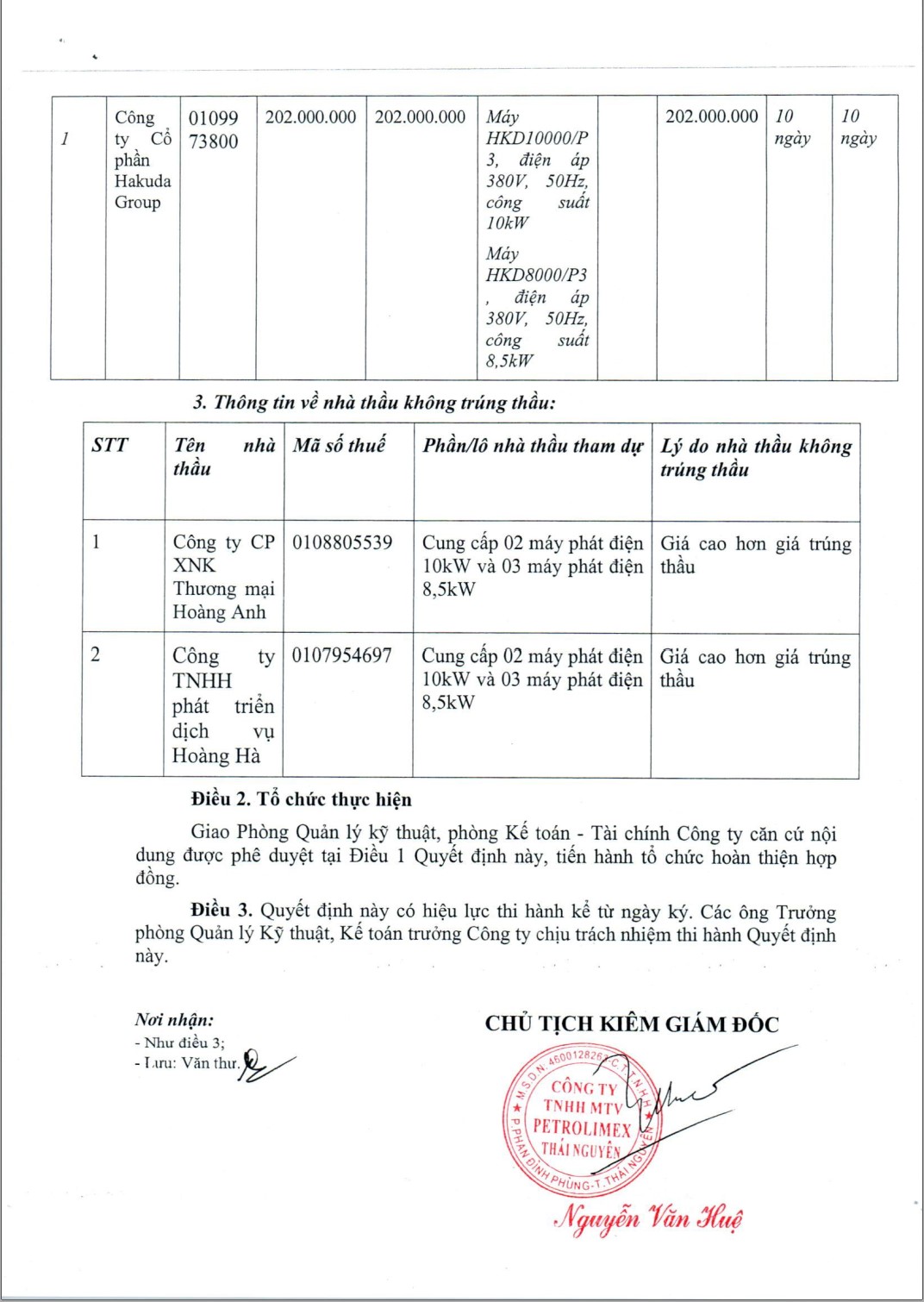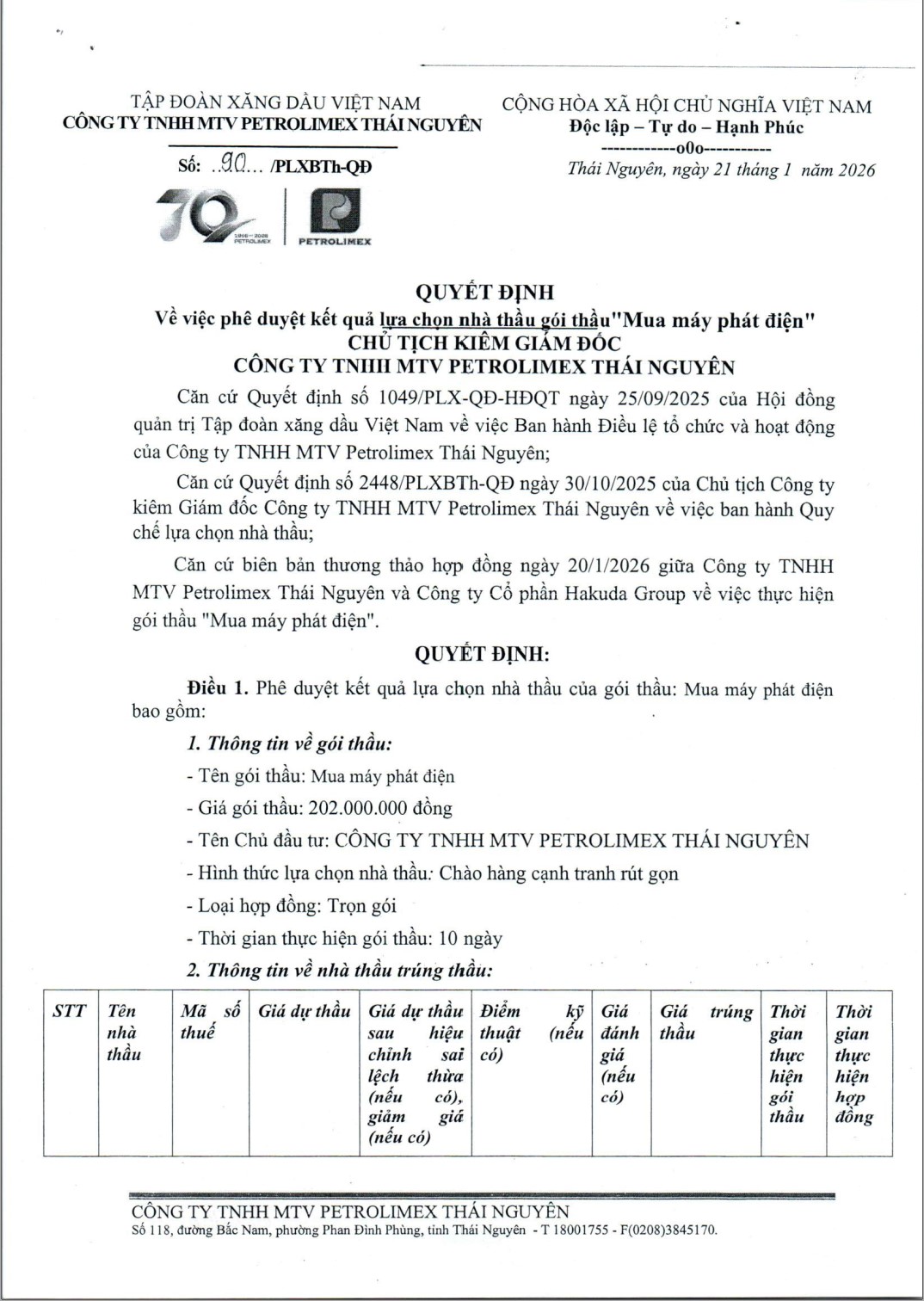 Căn cứ biên bản thương thảo hợp đồng ngày 20/1/2026 giữa Công ty TNHH MTV Petrolimex Thái Nguyên và Công ty Cổ phần Hakuda Group về việc thực hiện gói thầu "Mua máy phát điện".