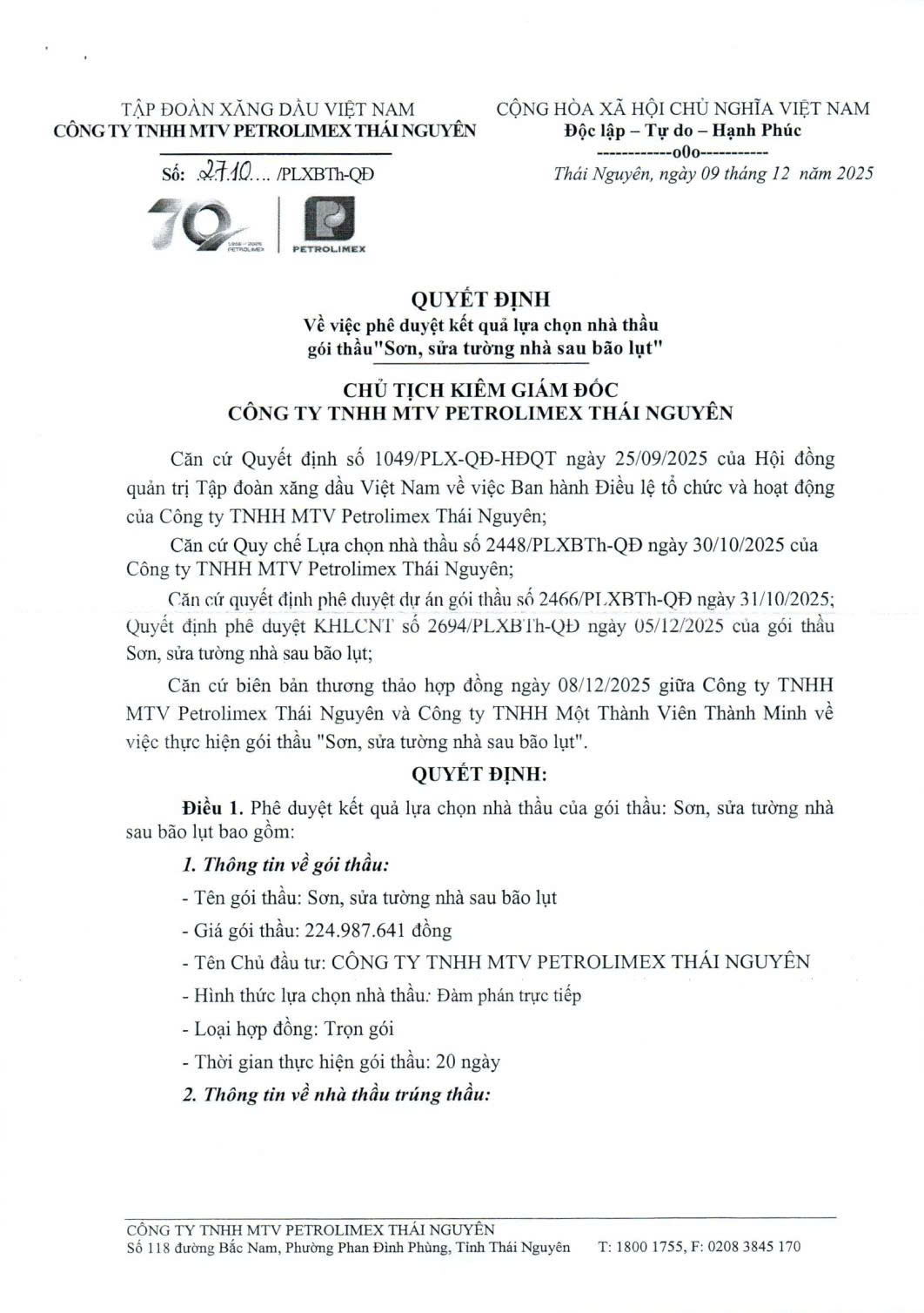 Căn cứ biên bản thương thảo hợp đồng ngày 08/12/2025 giữa Công ty TNHH MTV Petrolimex Thái Nguyên và Công ty TNHH Một Thành Viên Thành Minh về việc thực hiện gói thầu "Sơn, sửa tường nhà sau bão lụt".