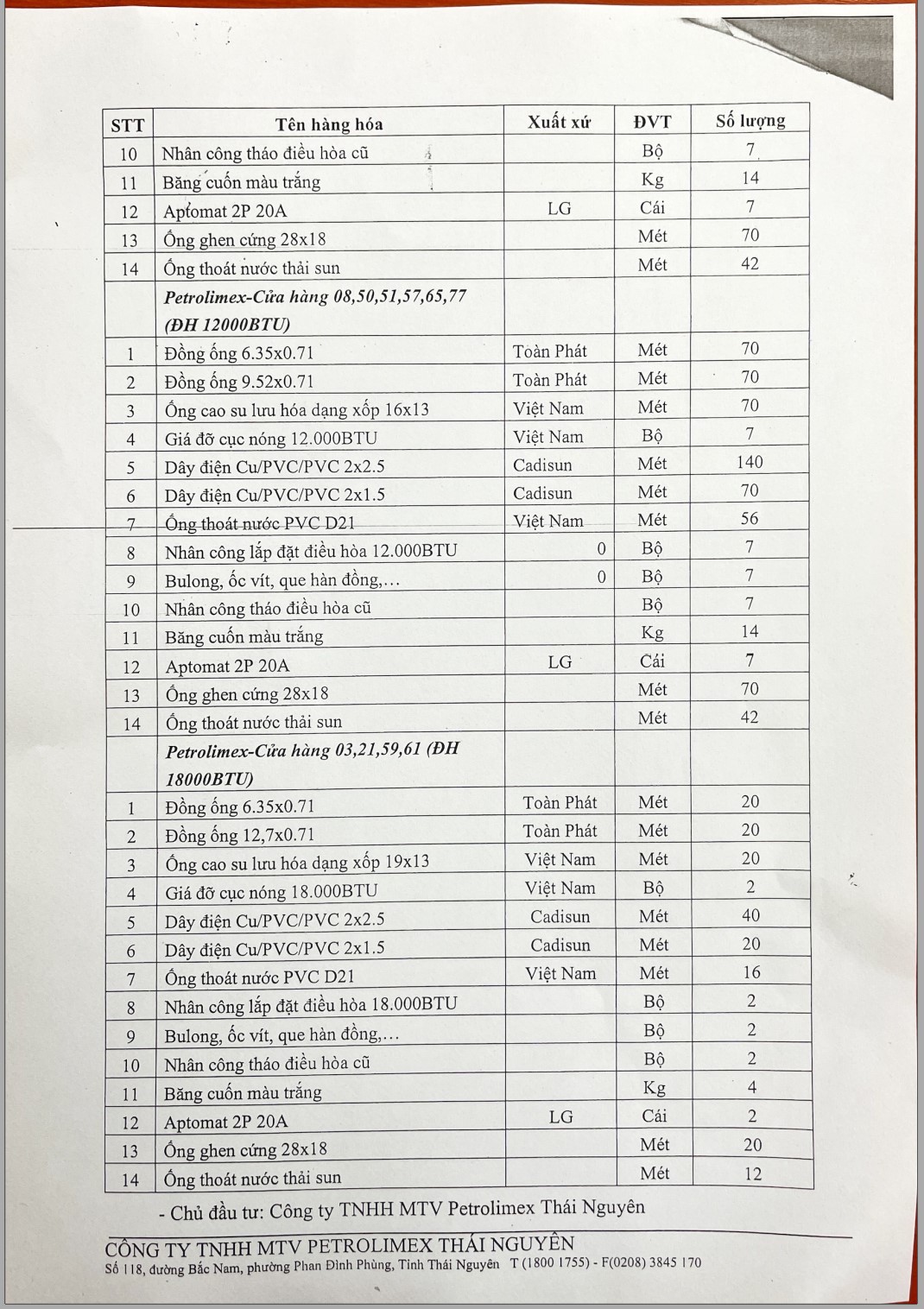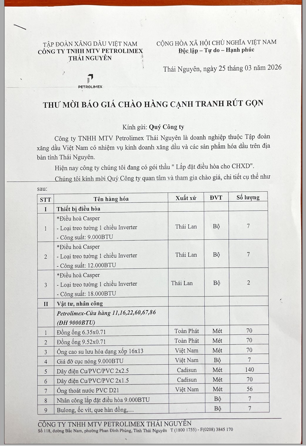 Công ty TNHH MTV Petrolimex Thái Nguyên là doanh nghiệp thuộc Tập đoàn xăng dầu Việt Nam có nhiệm vụ kinh doanh xăng dầu và các sản phẩm hóa dầu trên địa bàn tỉnh Thái Nguyên. Hiện nay công ty chúng tôi đang có gói thầu "Lắp đặt điều hòa cho CHXD".Chúng tôi kính mời Quý Công ty quan tâm và tham gia chào giá, chi tiết cụ thể như sau: