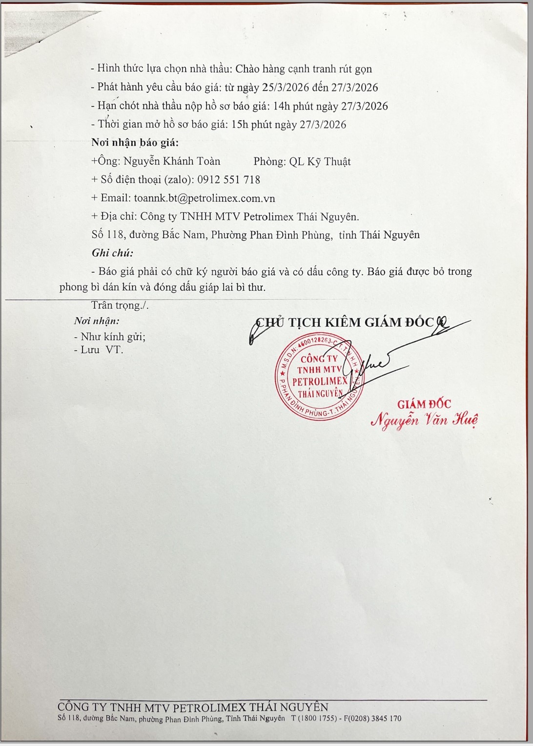Thư mời báo giá chào hàng cạnh tranh rút gọn gói thầu "Lắp đặt điều hòa cho CHXD"
