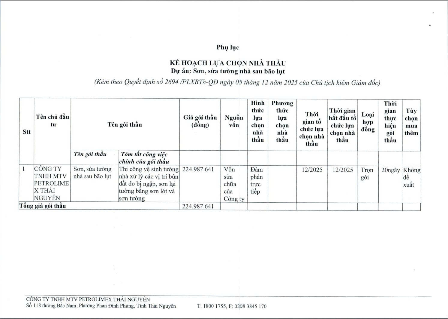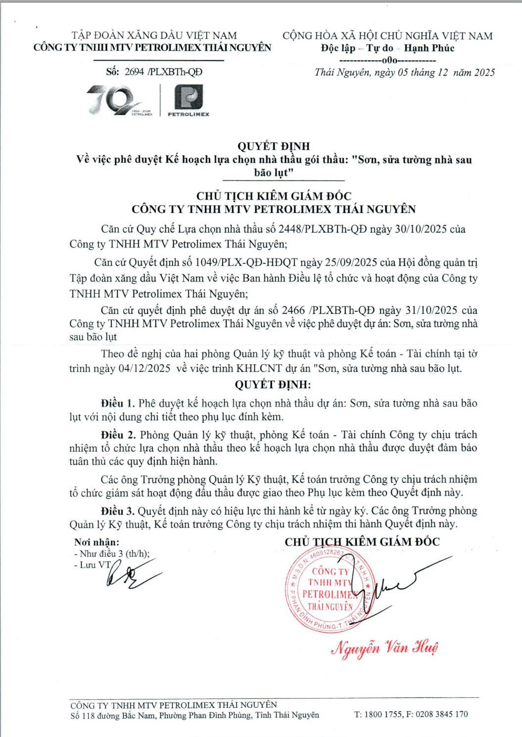 Căn cứ Quy chế Lựa chọn nhà thầu số 2448/PLXBTh-QĐ ngày 30/10/2025 của Công ty TNHH MTV Petrolimex Thái Nguyên; Căn cứ Quyết định số 1049/PLX-QĐ-HĐQT ngày 25/09/2025 của Hội đồng quản trị Tập đoàn xăng dầu Việt Nam về việc Ban hành Điều lệ tổ chức và hoạt động của Công ty TNHH MTV Petrolimex Thái Nguyên; Căn cứ quyết định phê duyệt dự án số 2466 /PLXBTh-QĐ ngày 31/10/2025 của Công ty TNHH MTV Petrolimex Thái Nguyên về việc phê duyệt dự án: Sơn, sửa tường nhà sau bão lụt Theo đề nghị của hai phòng Quản lý kỹ thuật và phòng Kế toán - Tài chính tại tờ trình ngày 04/12/2025 về việc trình KHLCNT dự án "Sơn, sửa tường nhà sau bão lụt.